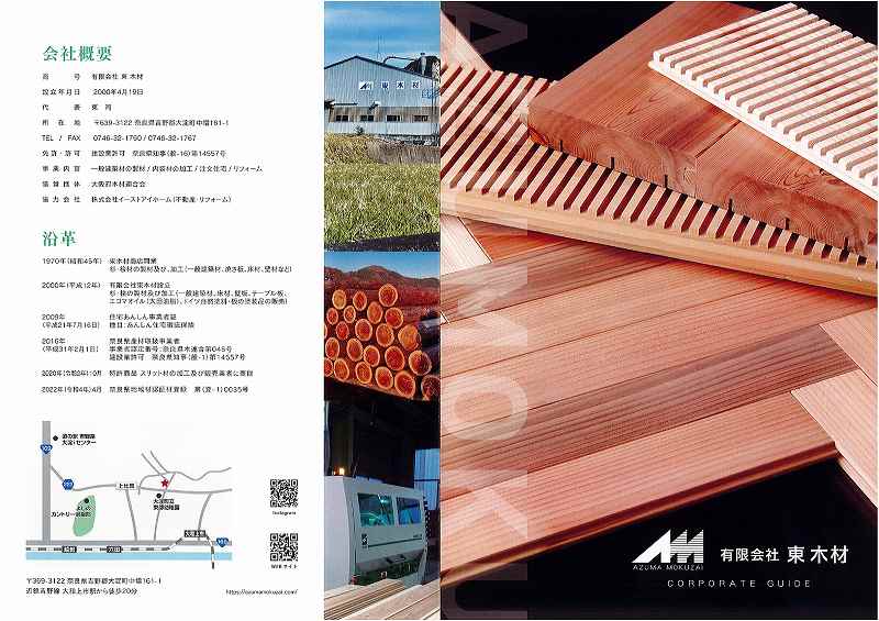 有限会社 東 木材 〒369-3122 奈良県吉野郡大淀町中増161-1 ■電話受付 8:30~18:00 ※土日祝除く ■mail azumoku1760@wind.ocn.ne.jp ■アクセス 近鉄吉野線 大和上市駅から徒歩20分 | ![]() |